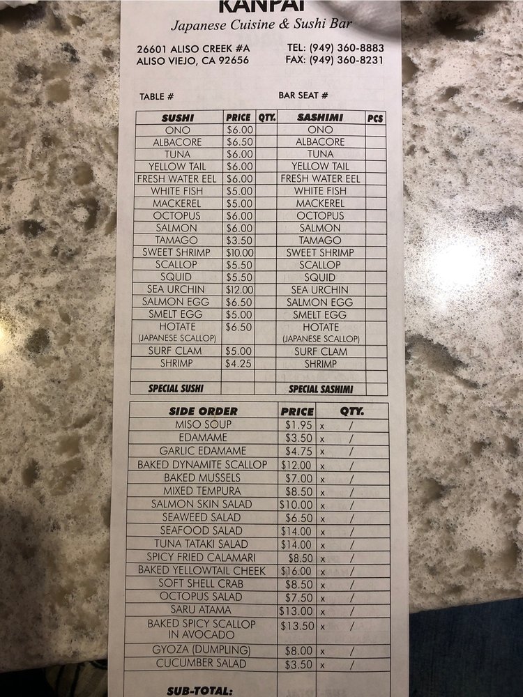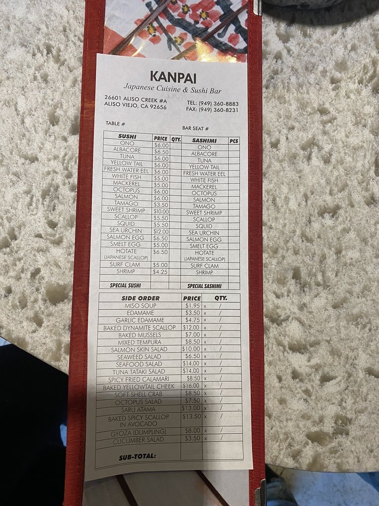 Welcome to Kanpai Sushi Aliso Viejo, a haven for sushi lovers nestled at 26601 Aliso Creek Rd. This vibrant eatery offers an enticing menu that features a broad selection of sushi and sashimi, including premium choices like Ono, Yellowtail, and Sea Urchin—each expertly prepared to highlight their fresh flavors.